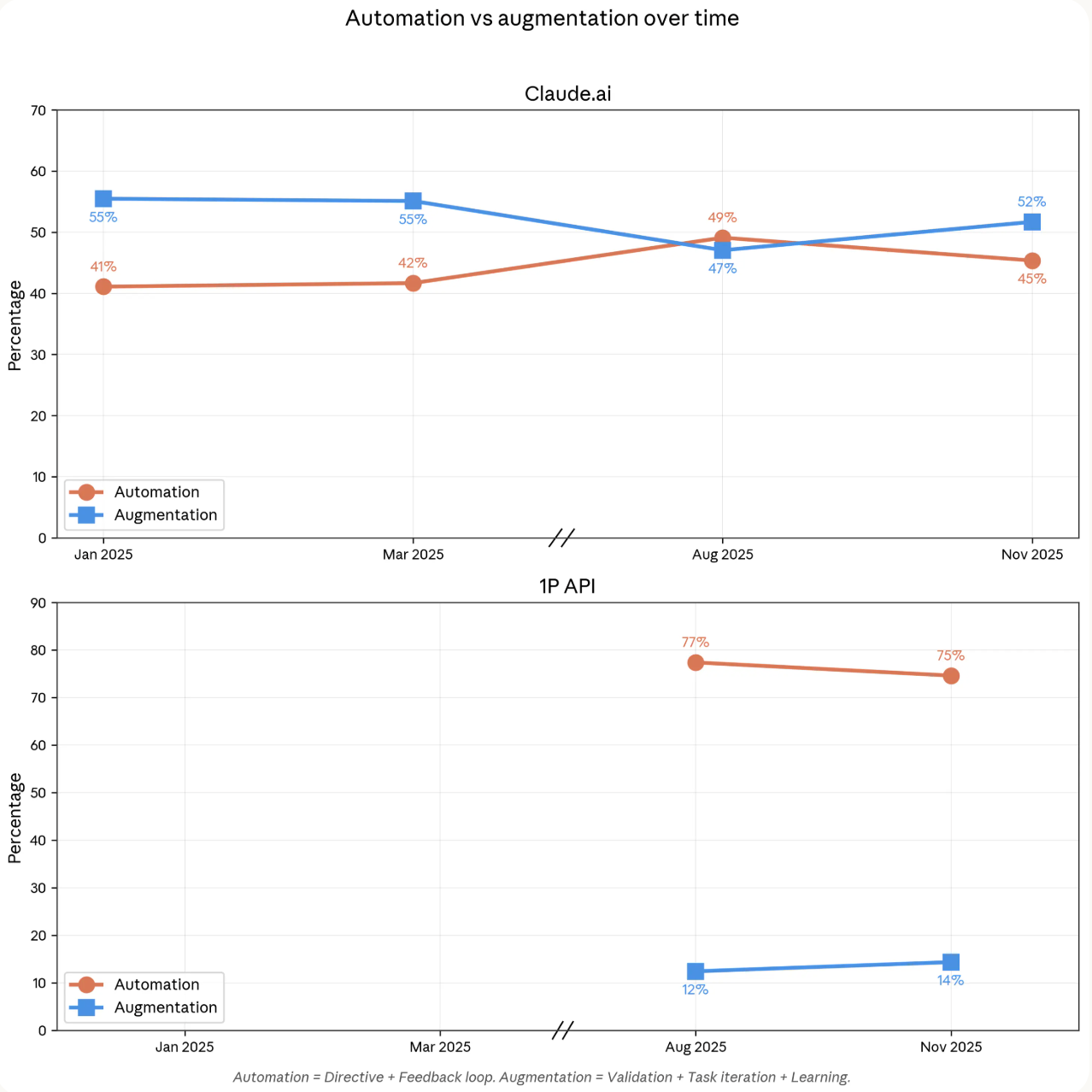 - 52% of interactions are collaborative, not fully delegated, suggesting humans still stay in the loop.