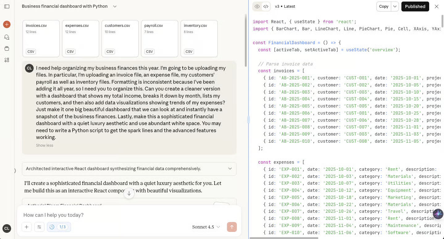 Claude can now take raw financial documents - invoices, revenue sheets, inventory lists - and automatically generate clean dashboards with charts, summaries, and aging reports.