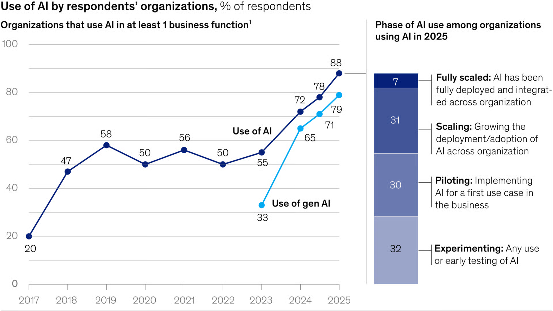 - 88% use AI, 33% scale it, 39% report EBIT impact, only 6% see 5% or more.