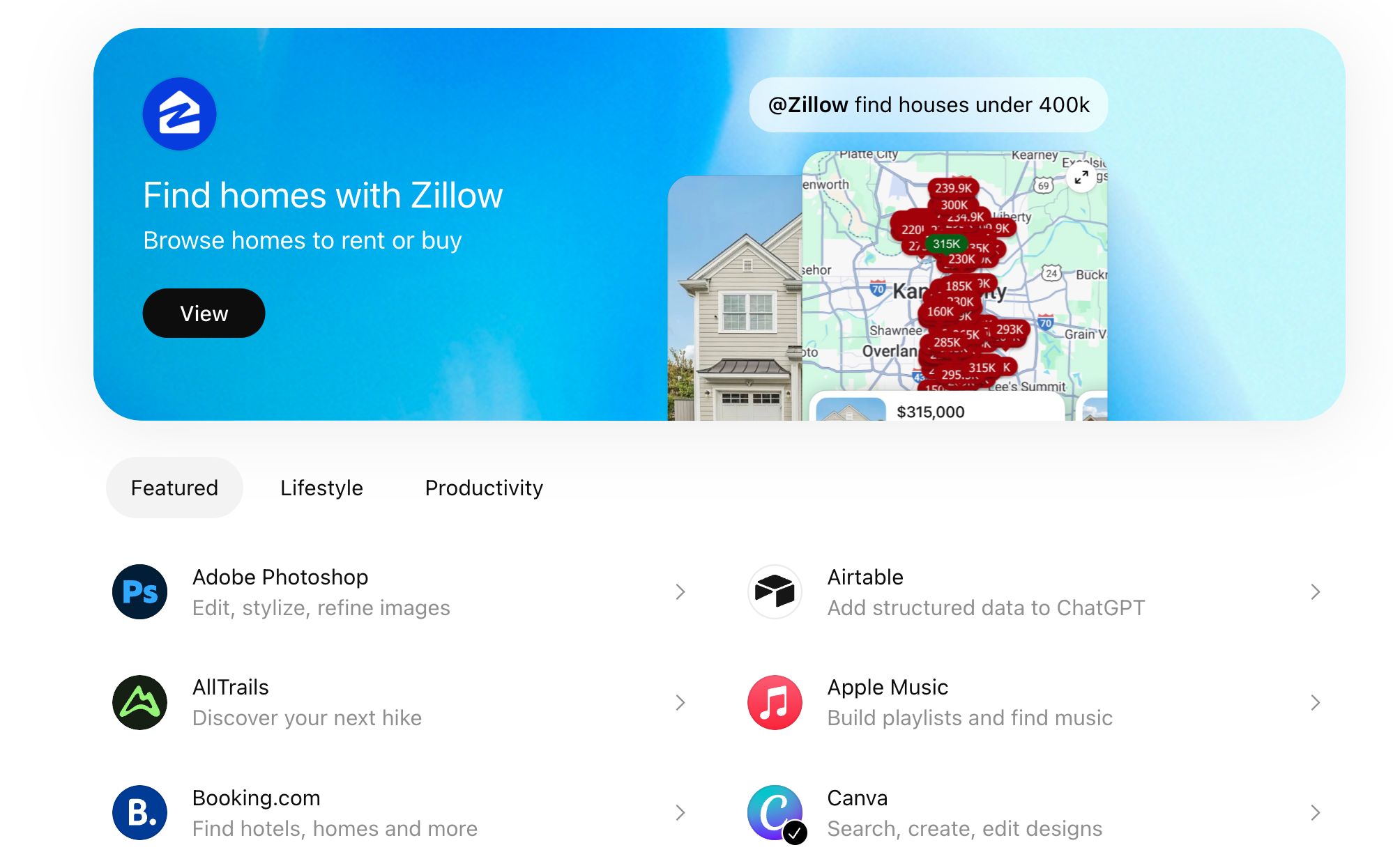 - Apps organized into Featured, Lifestyle, and Productivity categories