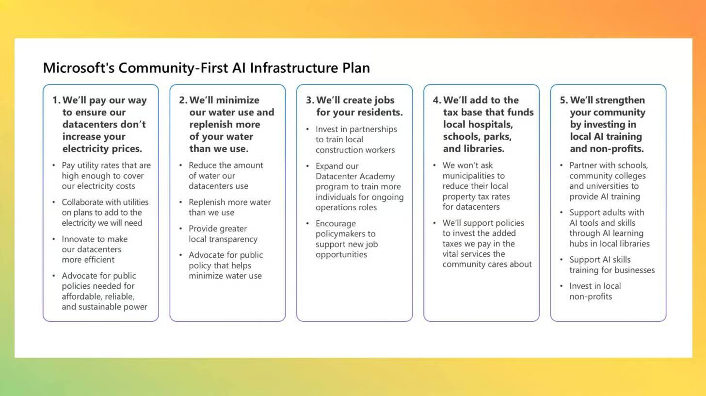 Meanwhile, Microsoft launched its Community-First AI Infrastructure plan, promising data centers that do not raise local power bills, replenish more water than they consume and pay full property taxes without incentives.