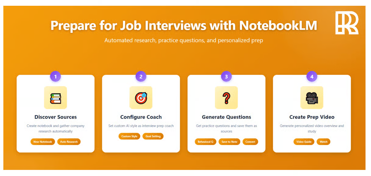 A step-by-step workflow shows how NotebookLM can prep candidates for job interviews by collecting company research, generating questions and producing personalized videos.