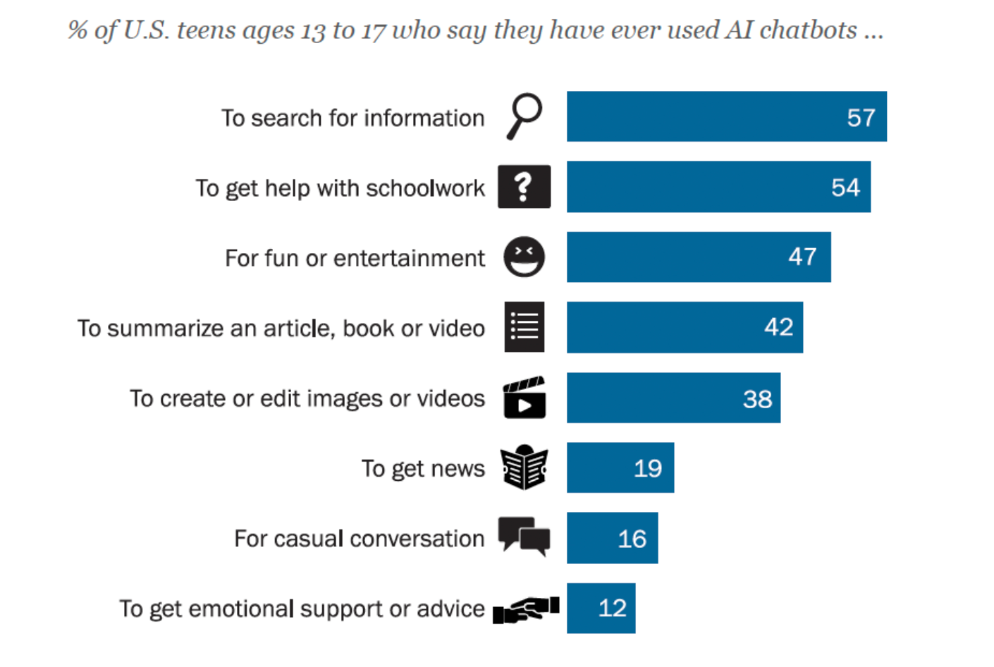 A new Pew Research Center survey of 1,458 U.S. teens and parents found AI adoption at mainstream levels among teenagers. Primary use cases include schoolwork, information gathering and entertainment.
